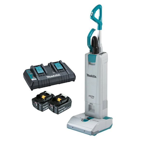 This Makita vacuum is a cordless upright powered by two 18V lithium-ion batteries (36V total), with a brushless motor and HEPA filtration.