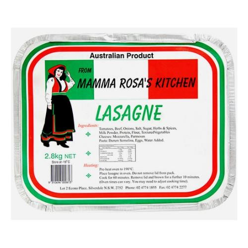 Mamma Rosa's Beef Lasagne is a delicious frozen lasagne made with 100% Australian premium minced beef with tomtoes, creamy bechamel sauce and topped with mozarella and parmesan cheese. Servings: Approx serves 6-9. Size: 2.8kg