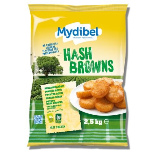 Mydibel Hash Brown Rounds. Grated and spiced potato preparation, prefried and frozen. Size: 2.5kg