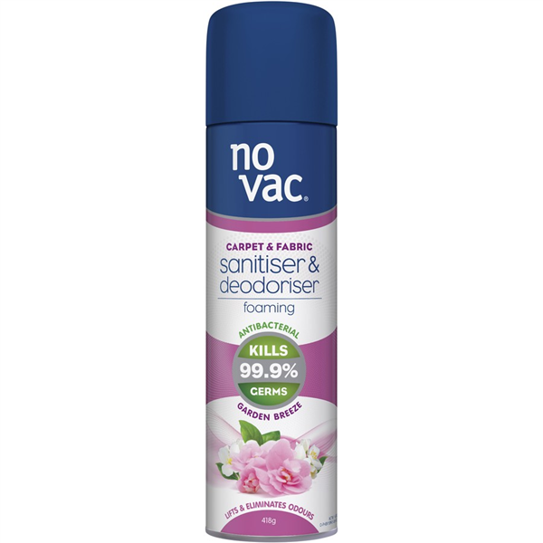 No Vac Foaming Sanitiser & Deodoriser Garden Breeze 418g is a ready-to-use aerosol sanitiser and deodoriser designed to clean and freshen surfaces without the need for rinsing or vacuuming.