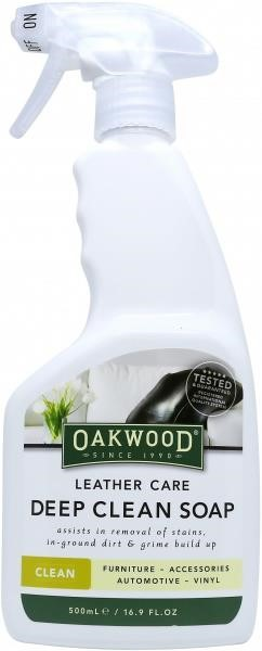 Oakwood Leather Care Deep Clean Soap 500ml is a pH-balanced cleaner designed to gently but effectively remove dirt, grime, body oils and odours from leather and vinyl surfaces.