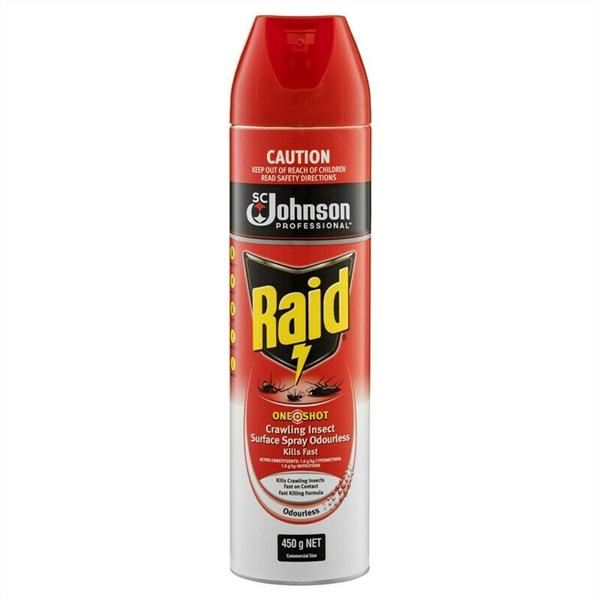 Raid one shot crawling insect surface spray odourless kills fast kills crawling insects fast on contact kills fast. Raid One Shot Crawling Insect Surface Spray Odourless Kills Fast has been specially formulated for people who don’t like the smell of regular insect sprays. Raid One Shot Crawling Insect Surface Spray Odourless Kills Fast kills in two ways - Kills crawling insects fast on contact and keeps on killing crawling insects for up to 4 weeks to provide long term protection.