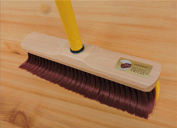 It features rake-shaped bristles that conform to floor surfaces and reach into corners and edges more effectively than flat brooms.