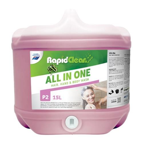 RapidClean All In One has been designed as an “all over” body wash, shampoo and hand cleaner. All In One is suitable for all amenities such as toilets, change rooms and showers, as well as retail outlets such as hair dressing salons. All In One can also be applied through most liquid soap dispensers