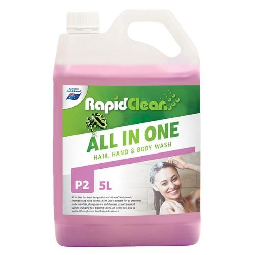 RapidClean All In One has been designed as an “all over” body wash, shampoo and hand cleaner. All In One is suitable for all amenities such as toilets, change rooms and showers, as well as retail outlets such as hair dressing salons. All In One can also be applied through most liquid soap dispensers