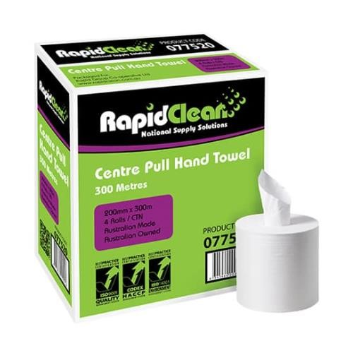 is designed for high-consumption environments where light spills, general wiping, and quick hand drying are required. Made from high-quality 1 Ply paper, it delivers superior strength and fast absorbency, allowing users to take as much or as little as needed for each task. The centre-feed dispensing system makes roll changes quick and simple while reducing waste and ensuring flexible usage. Proudly Australian made and owned, these towels are economical, durable, and compatible with all centre pull towel dispensers, including RapidClean models 033044 and 033054. Each roll measures 300m (approx. 1600 sheets) with a width of 20cm, supplied in cartons of 4 rolls for convenience