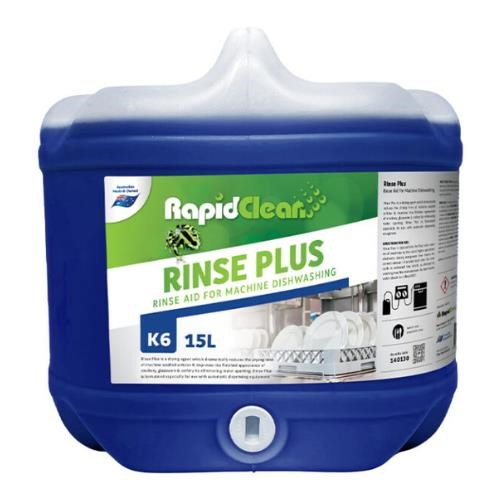RapidClean Rinse Plus Machine Rinse Aid is a drying agent which is added to the final rinse water of glass or dish washing machines, by a specially designed feeder or automated dispenser. Reduces drying time and improves the finished appearance. Effective in both soft and hard water, as it contains a water softener and anti-scaling agents