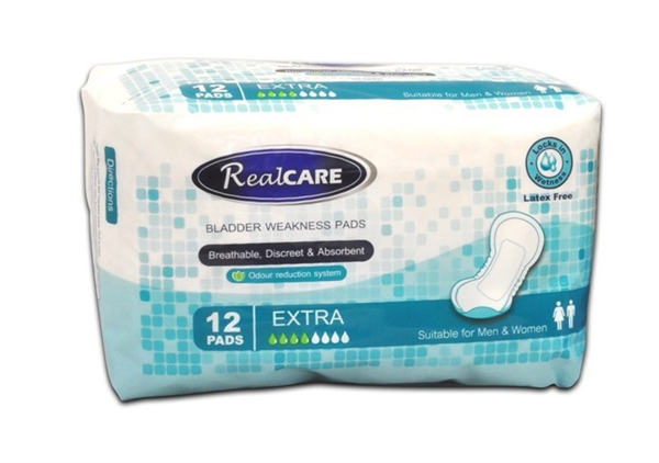 Real Care incontinence pads extra 12/pk. Breathable, Discreet & Absorbent. Suitable for men and women. Latex free. Odour reduction system.