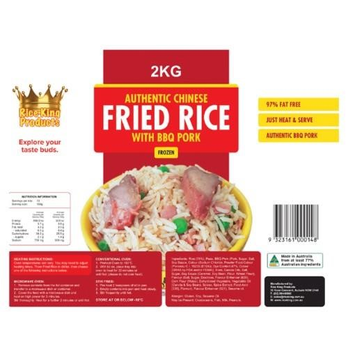 Rice King Fried Rice. Authentic Fried Frice with BBQ Pork. Fragrant rice prepared with succulent pork and fresh, hand-cut vegetables. Good source of protein. Low fat. Low Sugar. Contains: Gluten and Soy, may contain traces of Crustaceans, Fish, Milk and Peanuts. Size: 2kg