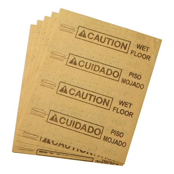 . Each yellow pad is coded with universal caution symbol and “Caution Wet Floor” message in English and Spanish