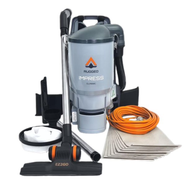 - The Rugged Impress Backpack Vacuum Cleaner is a commercial-grade backpack vacuum engineered for demanding cleaning environments where hygiene, mobility and comfort matter.