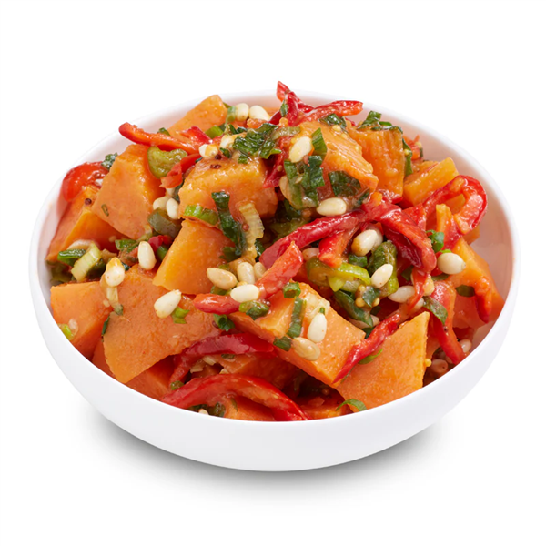 . Level up your side dish at your next party, barbeque or gathering with roasted hand-cut sweet potato, served with pine nuts and fresh veggies and tossed in a sesame oil dressing