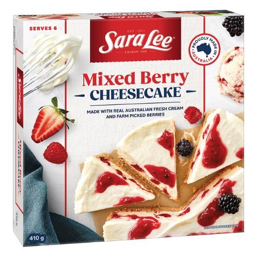 Sara Lee Cheesecake Mixed Berry. Made with farm picked strawberries and real Australian fresh cream. Perfect for a special occasion or 'just because'. Our Strawberry Coulis Cheesecake is made with fresh Australian cream and Neufchatel cheese, with swirls of tasty strawberry sauce, served on a scrumptious biscuit base. Australian made. No artificial colours and flaours. Australian fresh cream. Halal certified. Contains: Wheat, Gluten, Milk, Soy and may contain traces of eggs, peanuts, almonds, hazelnuts, peacan and walnuts. Servings: Approx 6 serves. Size: 410g
