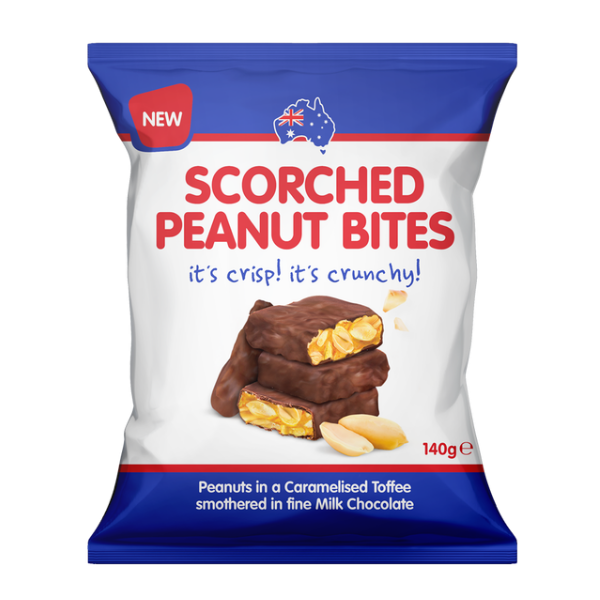 Scorched Peanut Bites one of Australia’s favourite milk chocolate bites, bigger and better than ever. True to it’s origins down to the packaging, Scorched Peanut bites will have you remembering the good old days, peanuts in caramelised toffee covered in milk chocolate. Great at the movies, giving as a gift, or just as a snack. Made in Australia. Contains: Soy, Milk, Nuts (tree nuts may be present). Size: 140g