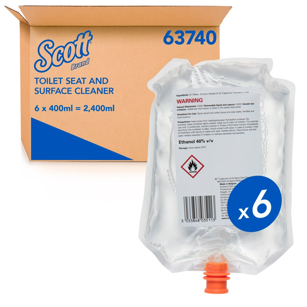 Scott Seat & Surface Cleanser 400ml 6/CTN 63740 is a convenient hygiene spray designed for cleaning toilet seats and other hard surfaces before use.