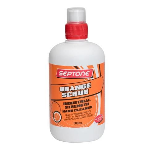 PRODUCT DESCRIPTION. Septone Orange Scrub Hand Cleaner 500ml is a powerful, citrus-based, waterless hand cleaner designed to remove stubborn industrial grime quickly and effectively. Infused with natural citrus oils and fine pumice abrasives, this biodegradable formula cuts through grease, oil, mud, coal dust, and tree sap without the need for water. Its pH-balanced, silicone-free base is enriched with moisturisers to leave hands clean, soft, and refreshed