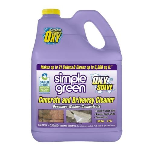 PRODUCT DESCRIPTION. Simple Green Oxy Solve Concrete and Driveway Cleaner 3.78L is a professional-grade, peroxide-powered cleaner designed to cut through oil, grease, tire marks, and organic staining on concrete and masonry. This environmentally safe formula lifts grime without bleach or harsh fumes, restoring the natural appearance of outdoor surfaces while being gentle on plants, pets, and wildlife. Ideal for use with pressure washers or manual application, it makes up to 21 gallons of cleaning solution and covers up to 6,300 sq ft