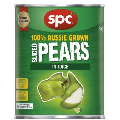 SPC Sliced Pears In Juice contain no added colours flavours or preservatives. Australian Made. Size: 3kg