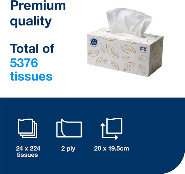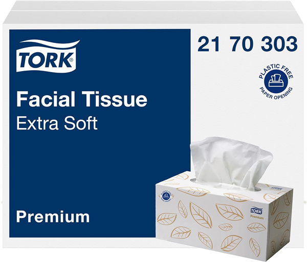 Tork Soft Facial Tissue provides 224 tissues in a stylish box design. The tissues are 2 ply providing extra comfort, softness, absorbency and strength. Premium tork tissues providing extra comfort, softness, absorbency and strength. Box comes with a stylish, contemporary design. Code: 2170303. Quantity: 24 Boxes Per Carton