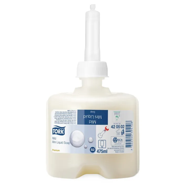 Tork Mild Mini Liquid Soap. Tork Mild Mini Liquid Soap has moisturizing and replenishing ingredients proven mild to the skin for gentle hand washing. Mildly fragranced, and with moisturizing and lipid replenishing ingredients care for the skin. Certified effortless maintenance and intuitive refilling in less than 10 seconds. Hygienic: Sealed refill with single use pump reduces risk of cross contamination. Suits Tork Dispensers 561000 and 561008. Code: 420502. Size: 475ml Pod. Quantity: 8 Pods Per Carton
