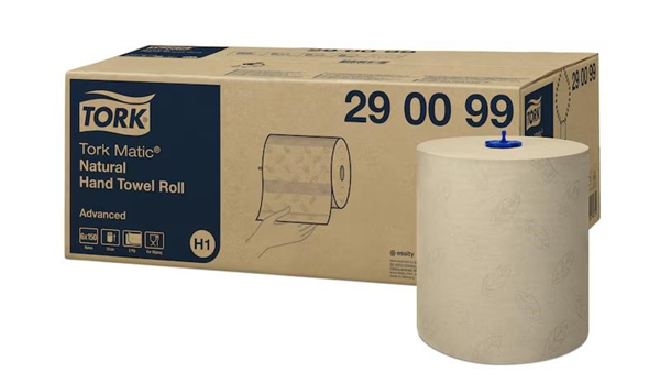 combines softness, strength, and sustainability in one premium hand drying solution. Made from 100% recycled fibres, including recycled cardboard boxes, these towels feature a natural light brown colour that highlights your environmental commitment while maintaining Tork’s trusted quality. With a grey leaf décor embossing for an elegant look, the 2 Ply design ensures comfort and effective absorbency. Designed for use with the Tork Matic® Hand Towel Roll Dispenser, the 150m rolls save time with fewer refills, while one-at-a-time sheet dispensing reduces waste and promotes hygiene in high-traffic washrooms
