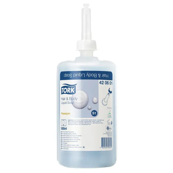 Tork® Shower Cream (formerly Hair & Body Liquid Soap) gives hotels, schools and sports facilities the convenience of a shower gel and shampoo in one efficient unit. It has a mild formula with a refreshing, unisex fragrance that leaves skin and hair feeling soft. Suitable for Tork® Liquid Soap Dispensers. A 2-in-1 formula contains caring and mild ingredients. Quick and easy refilling proven with easy-to-use certification by the Swedish Rheumatism Association. Sealed bottle with single-use pump secures good hygiene and reduces risk of cross-contamination.