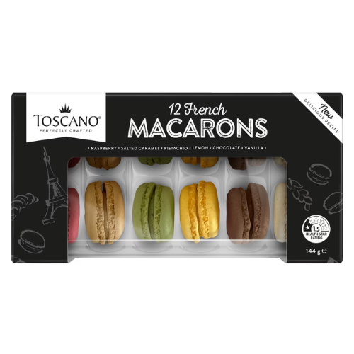 Toscano Macarons are premium French-style almond meringue biscuits with a crisp shell and soft, chewy centre, filled with smooth flavoured cream.