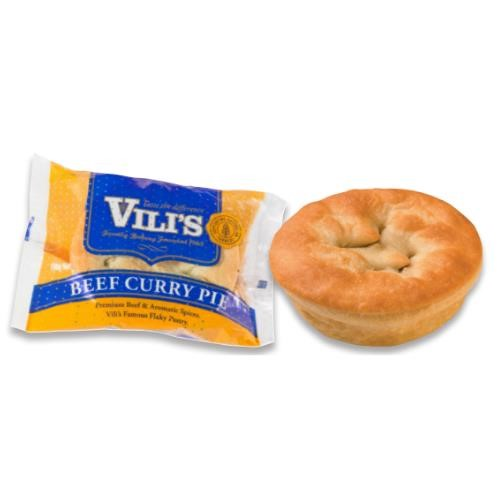 Vilis Curry Beef Pie has tender lean beef and tasy dry spices, including cumin, coriander, chilli, fenugreek, turmeric, fennel, garlic & ginger. Individually Wrapped. Size: 160g