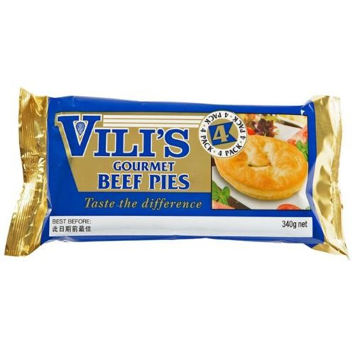 Vilis Beef Pie is a No.1 seller using 100% minced beef and rich gravy & flaky pastry. Size: 340g. Quantity: 4 pies per pack