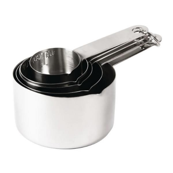 Ensure you always follow your recipes to the letter with this high quality Vogue measuring cup set. Supplied with 30ml, 60ml, 80ml, 125ml and 250ml capacity cups, this set gives you everything you need to replicate your recipes with expert precision and guarantee perfect results every time. Crafted from tough stainless steel, the cups are immensely durable and robust, allowing them to endure the rigours of constant use in any busy kitchen without breaking. The stainless steel construction also makes these measuring cups incredibly easy to clean, helping you keep them in immaculate condition at all times. Contents: 1 x 30ml, 1 x 60ml, 1 x 80ml, 1 x 125ml and 1 x 250ml. Imperial contents: 1 x 1/8 cup, 1 x 1/4 cup, 1 x 1/3 cup, 1 x 1/2 cup and 1 x 1 cup. Incredibly hardwearing. For quick and accurate measuring. Easy to clean. Capacity: 30ml, 60ml, 80ml, 125ml & 250ml. Dimensions: 41mm (H) x 81mm (Ø). Material: Stainless Steel. Weight: 290g