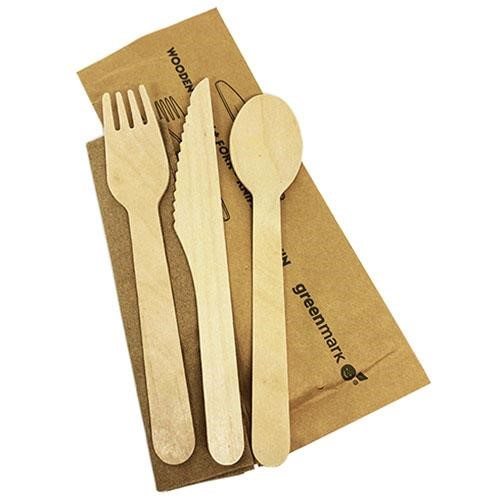 Pre-packed wooden cutlery set fork/knife/spoon/napkin, great for takeaway. Greenmark wooden cutlery is manufactured from natural wood using sustainable forestry practices that do not damage the environment. Food safe. Eco friendly option, eco chic look. We carry wide product range: from spoon, fork and knife to spork and chopsticks, coffee stirrers and ice-cream sticks. Pre-packed cutlery fork/knife/napkin and fork/knife/spoon/napkin are great choice for takeaway and events. Strong and durable. In addition to its elegant and clean look, this renewable wood products are also biodegradable and compostable.