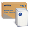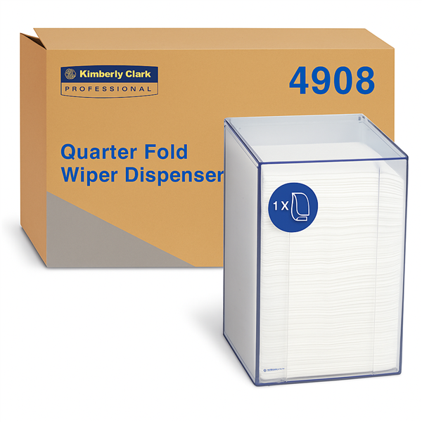 The WYPALL Quarter Fold Clear Dispenser 4908 is a compact, durable dispensing unit designed for hygienic, controlled access to WYPALL quarter-fold wipers.