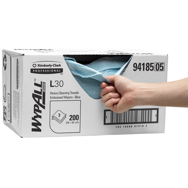 WypAll L30 Embossed Blue 3 Ply 200/CTN is a premium disposable wiping cloth designed for light to medium-duty cleaning tasks.