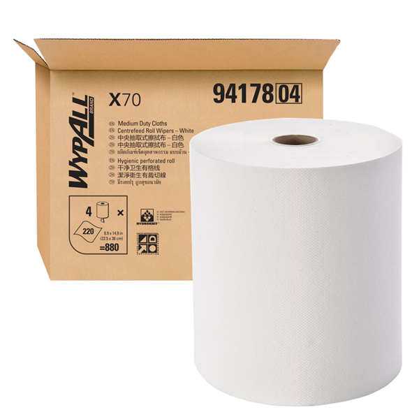 • WypAll X70 Centrefeed White 220 Sheets/Roll 4/CTN 94178 is a high-performance reusable wiping cloth roll designed for demanding cleaning tasks.
