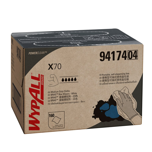 WypAll X70 Single Sheet White 160/CTN 94174 is a heavy-duty disposable wiping cloth designed for demanding cleaning and maintenance tasks.