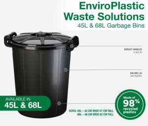 Here's our waste management and recycling range, featuring the innovative EnviroPlastic 45 & 68Lt Garbage Bins, made of 98% recycled plastic. This dedication ensures durability, reliability, and exceptional performance.