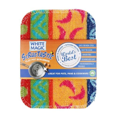 Scrubtastic is the world’s best multi-purpose scourer. Makes cleaning fast and easy plus they last up to 10 times longer than synthetic scourers! Made from 100% cotton with a non-toxic patented coating the White Magic Scrubtastic is built to outlast its synthetic counterparts so reducing the impact on the environment. Perfect for cleaning: Stainless Steel Pots & Pans, Enamelled Cast Iron Cookware, Cast Iron Cookware, Non-Stick Pots & Pans, Glass, Ceramic & Stainless Steel Cooktops, Ovens, Benchtops, Sinks, Vegetables, BBQs. To clean and sanitise the White Magic Scrubtastic simply put in the dishwasher, washing machine or a pot of boiling water.