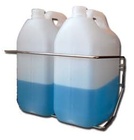 Vertical storage of two 5L chemical, cleaning, sanitising or food-service liquids.