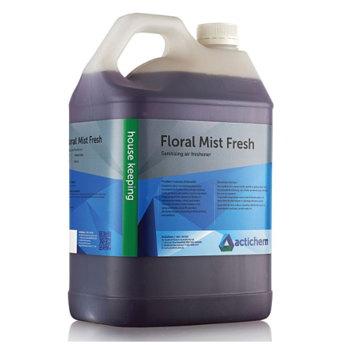 Floral Mist Fresh – is a pleasantly perfumed air freshener containing anti-bacterial, anti-fungal and anti-viral agents effective both in the vapour phase and on surfaces. It’s sophisticated biocidal chemistry not only destroys odour causing germs, but removes infections and harmful bacteria from the air and surfaces. Regular use of Floral Mist, helps prevent the transmission of disease and germs in community homes, clinics, hospitals and child care centres. Floral Mist can be used in community homes, clinics, nursing homes, motels, restaurants, sports clubs, change rooms, toilets, child care centres, etc. Size: 5L
