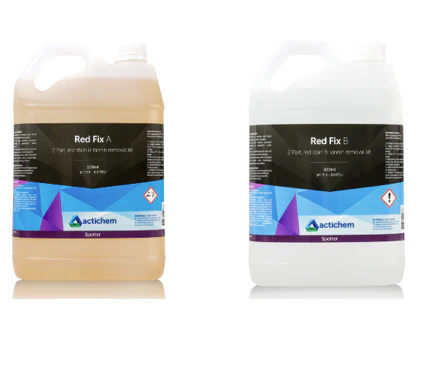 Actichem Red Fix Kit 5L is a specialised stain treatment solution designed to remove stubborn red dye stains caused by wine, cordial, soft drinks, food colouring, and fruit spills.