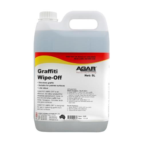 PRODUCT DESCRIPTION. Agar Graffiti Wipe-Off Remover 5L is a ready-to-use, high-performance cleaner formulated to eliminate graffiti like spray paint, permanent markers, ink, crayon, and pen with ease. Designed for use on smooth, non-porous surfaces including glass, metal, painted finishes, plastic, and laminates, this fast-acting formula allows graffiti to be wiped away without heavy scrubbing. Perfect for councils, schools, cleaning contractors, and public transport services, its efficient action and convenient 5L bulk size make it ideal for both large-scale and routine graffiti removal