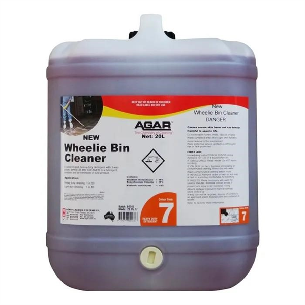 WHEELIE BIN CLEANER 20L is a high-strength detergent concentrate specially formulated to clean, sanitise, and deodorise large volumes of waste bins in commercial, industrial, and municipal environments. It effectively removes garbage spills, grime, and organic matter while killing bacteria and odour-causing germs, leaving bins fresh and hygienic. WHEELIE BIN CLEANER is suitable for plastic and metal bin surfaces, including wheelie bins, steel dumpsters, and bulk rubbish containers. The economical 20L size is ideal for high-frequency use in waste management services, councils, and large-scale facilities