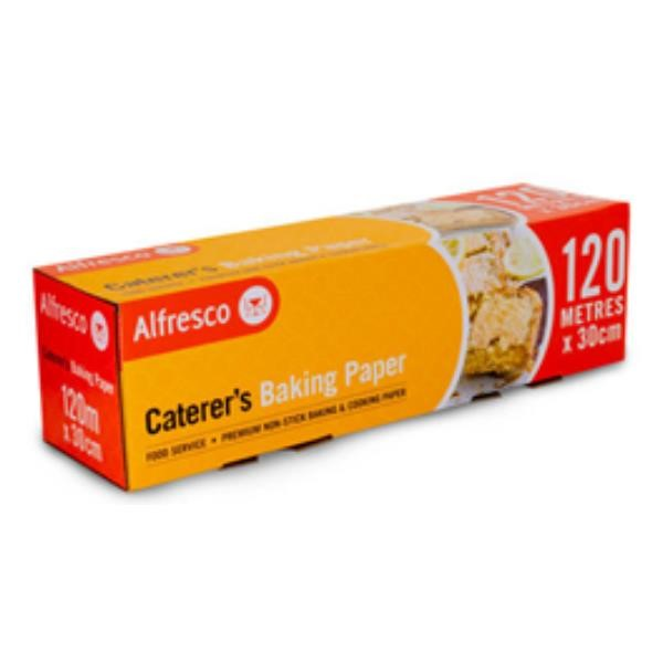 Alfresco Caterer's Baking paper makes your baking and cooking easier. Its non-stick coating, is a healthier way to cook with no need to grease or bake with fats or oils. Can withstand temperatures up to 230 degrees Celsius. Can be used in conventional microwave ovens. Seals in moisture and flavour when cooking. Handy for rolling pastry and dough. Size: 120m x 30cm. Code: ABP30