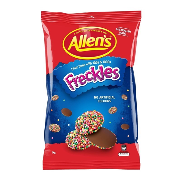 These Allen's Freckles come in a large 1 kg bag making them ideal for sharing with friends at work. Each freckle is made of creamy chocolate and coated with 100's and 1000's. No artificial colours. Australian made. Size: 1kg Bag