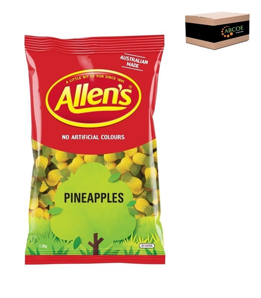 Allens Pineapple Lollies are bite-sized pineapple gummies, Send your taste buds to paradise when you nibble on a few of Allen’s deliciously sweet Pineapples. No artificial colours. Australian made. Nut Free. Size: 6 x 1.3kg bags per carton