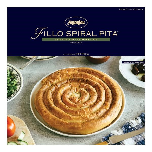 Our authentic Fillo Pastry is spiralled by hand and generously filled with the finest ingredients. It’s proudly made in Australia with love by the Antoniou family. Conveniently packed in a foil tray, you can take it straight from the freezer to the oven. Serve as a side dish at your next BBQ, serve a few to satisfy a crowd at a party, or just add a side salad for a quick and simple family meal. Fetta & Ricotta Flavour (stock standard image used). Frozen Product. 900g