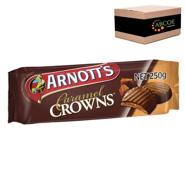 Arnott's Caramel Crowns is delicious biscuit, gooey caramel and Arnott's Real Chocolate, made from the finest cocoa ingredients and Australian natural milk products. Carefully combined to create your perfect indulgence. Australian Made. Size: 200g. Quantity: 20 packs per carton