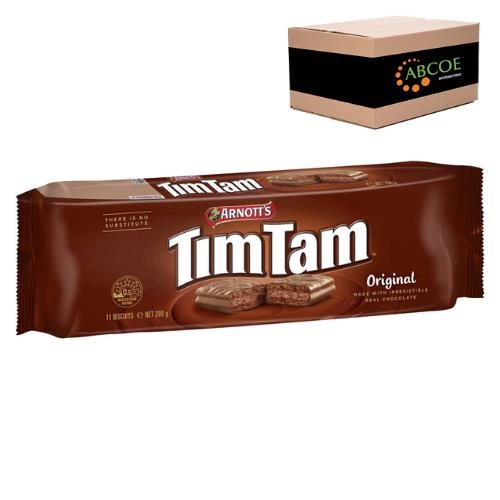 Arnott's Tim Tam Original chocolate biscuits made with irresistible real chocolate. The most irresistible chocolate biscuit. A mouth-watering combination of crunchy biscuit, creamy filling and real chocolate coating, it's easy to see why Tim Tams are Australia’s most-loved chocolate biscuit. Share a packet of these deliciously sweet biscuits with your friends and family today. Australian Made. Contains: Milk, Soy, wheat and Gluten may also contain traces of Egg, Peanuts, Sesame & Tree nuts. Size: 200g. Quantity: 24 packets per carton