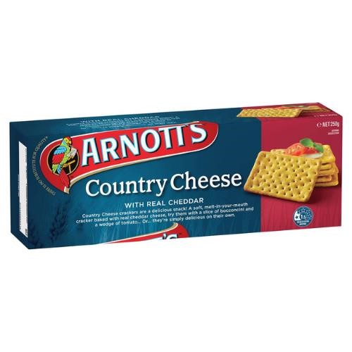 Arnott's Crackers Country Cheese with real cheddar. Country Cheese crackers are a delicious snack! A soft, melt-in-your-mouth cracker baked with real cheddar cheese, try them with a slice of bocconcini and a wedge of tomato... Or... they're simply delicious on their own. Australian Made. Contains: Barley, Gluten, Milk, Soy, Wheat and may contain traces of Egg, Peanuts, Sesame and Tree Nuts. Size: 250g