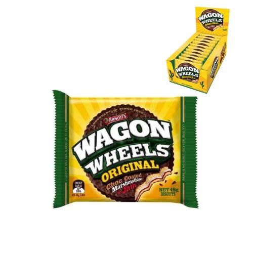 Arnott's Wagon Wheels Original Choc Coated Marshmallow & Jam there is no substitute for quality. Contains: Milk, Soy, Wheat, and may contain traces of Egg, Nuts, Pine Nuts and Tree Nuts. Size: 48g. Quantity: 16 packs per pack
